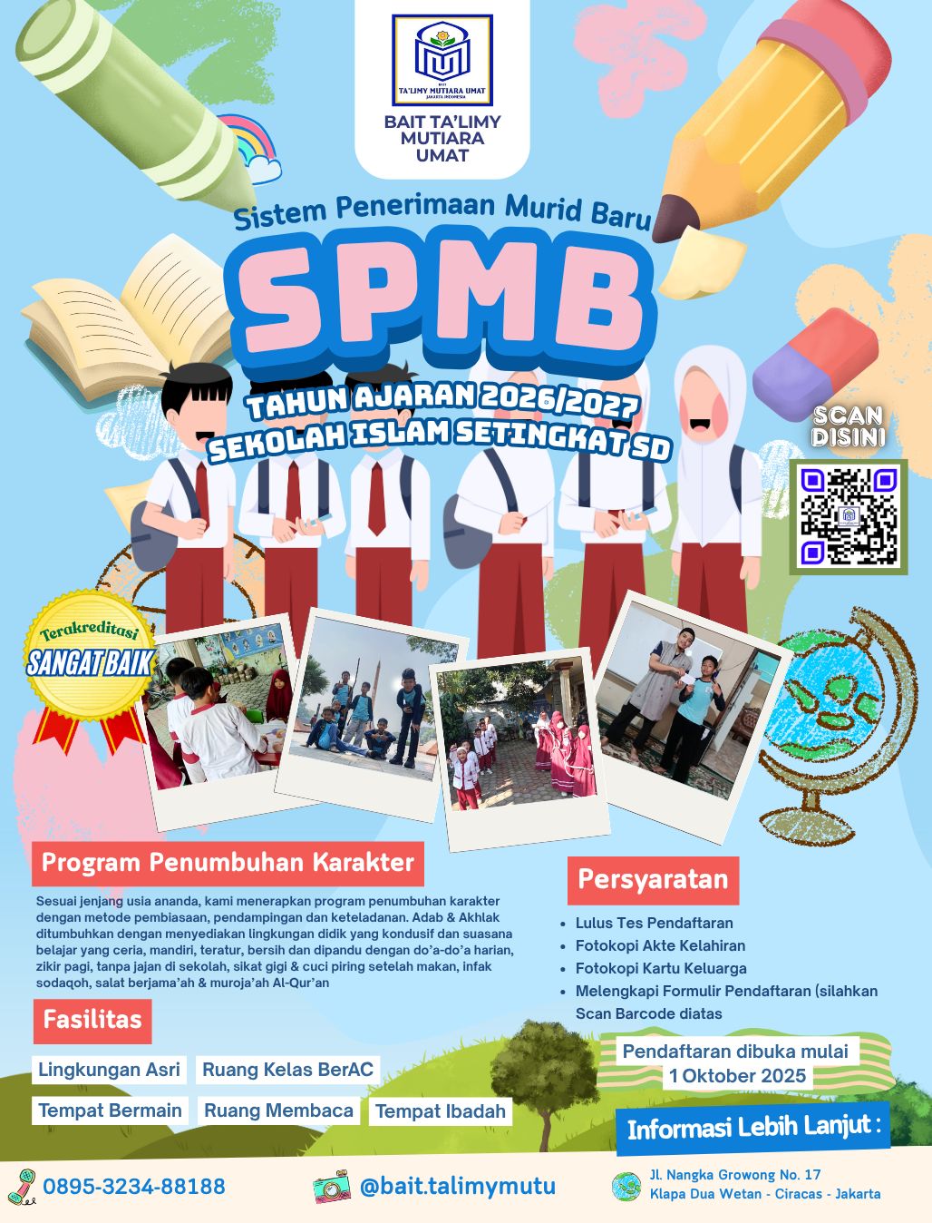 Sesuai jenjang usia ananda, kami menerapkan program penumbuhan karakter dengan metode pembiasaan, pendampingan dan keteladanan. Adab & Akhlak ditumbuhkan dengan menyediakan lingkungan didik yang kondusif dan suasana belajar yang ceria, mandiri, teratur, bersih dan dipandu dengan do’a-do’a harian, zikir pagi, tanpa jajan di sekolah, sikat gigi & cuci piring setelah makan, infak sodaqoh, salat berjama’ah & muroja’ah Al-Qur’an