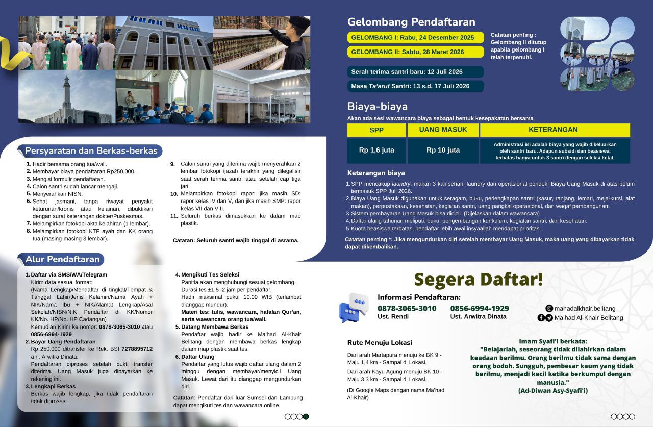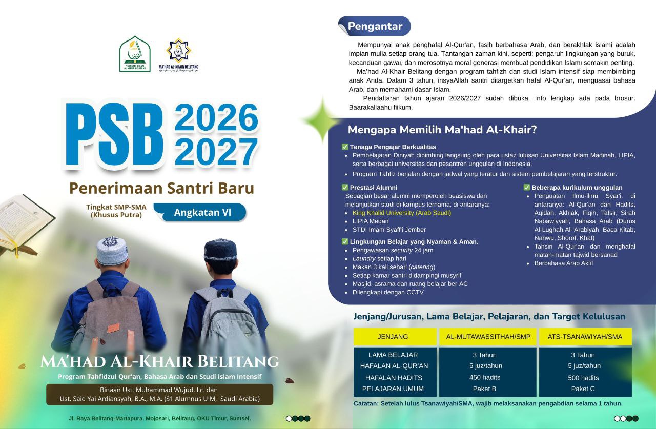 PENERIMAAN SANTRI BARU (PSB) QUDWATUNAA ISLAMIC BOARDING SCHOOL BENGKULU SELATAN T. P. 2022/2023 "Membina Iman Ilmu dan Taqwa"Qudwatunaa Islamic Boarding School adalah Pondok Pesantren Tahfizh Al-Qur'an bermanhaj ahlussunnah wal jama'ah yang terletak di Desa/Kelurahan Masat, Kecamatan Pino, Manna, Bengkulu Selatan. JENJANG PENDIDIKAN :Jenjang pendidikan di bawah naungan Albinaa Islamic Boarding School dengan menerapkan kurikulum wajib 6 tahun pendidikan 30 juz bersanad yang memiliki standard bacaan tartil dan mutqin. Mutawassithah (setingkat SMP) 3 tahun pendidikan dengan target hafalan 15 juz. Tsanawiyah (setingkat SMA) 3 tahun pendidikan melanjutkan target hafalan hingga 30 juz. PEMBINA :Ust. Aslam Muhsin Abidin, Lc.(Alumni Universitas Islam Madinah - Fakultas Hadits) TENAGA PENDIDIK :Alumni universitas dalam maupun luar negeri yang tsiqah di bidangnya. WAKTU PENDAFTARAN : Gelombang I : 1 s/d 28 Februari 2022.Tes Seleksi : 1 Maret 2022. Gelombang II : 2 s/d 30 Maret 2022.Tes Seleksi : 31 Maret 2022.Kuota Terbatas untuk Yatim dan Dhuafa Angkatan...