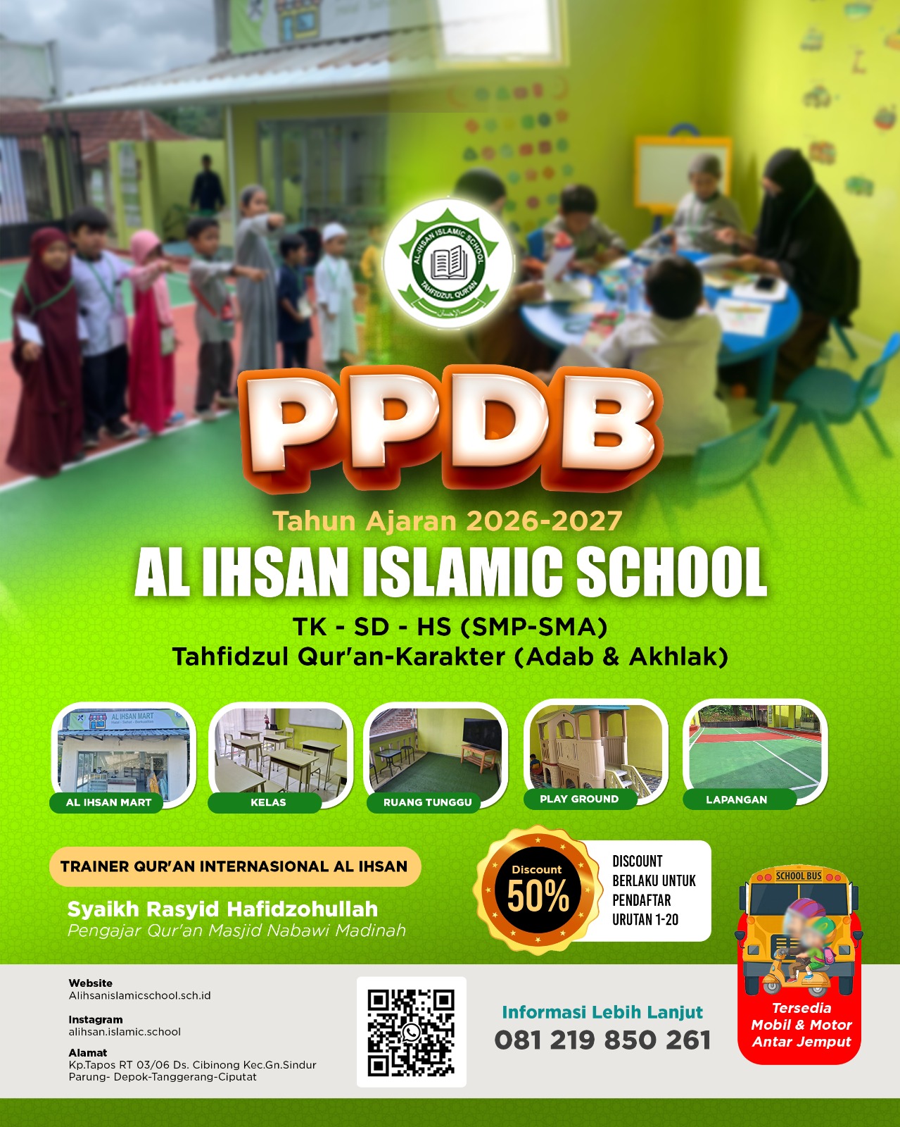 Bismillah Assalaamu'alaykum Warohmatullahi Wabarokaatuh Hamdan Katsiron mubaarokan fiih Kami Yayasan Hubbu Sunnah Center menaungi lembaga Al Ihsan Islamic School dan Tarbiyah Center (Lembaga Konsultan Pendidikan) sangat bersyukur kepada Allah semoga lembaga pendidika Al Ihsan bisa berkembang memberikan kontribusi banyak untuk pendidikan indonesia Sekolah Al Ihsan islamic school terdiri dayacare, TK,SD, SMP , SMA, Home schooling , Boarding dan Ponpes Khusus untuk Parung- Gn.Sindur TK dan SD Semoga dengan hadirnya lembaga pendidikan didaerah parung -Gn.Sindur bisa memberikan warna pendidikan yang sesuai Qur'an dan Hadits Program unggulan Al Ihsan Islamic school pendidikan agama 80% dan umum 20 % dan pendikan Tahfizul Qur'an dan Karakter (Adab) ditambah dengan life skill Dengan hadirnya Al Ihsan islamic school menjawab pentingnya pendidikan sejak usia dini yang berbasis sesuai sunnah yang mencetak anak2 sholeh dan sholehah sukses dunia dan akhirat Semoga niat dan ikhtiar kita semua selalu dipermudah oleh Allah Ta'ala..aamiin