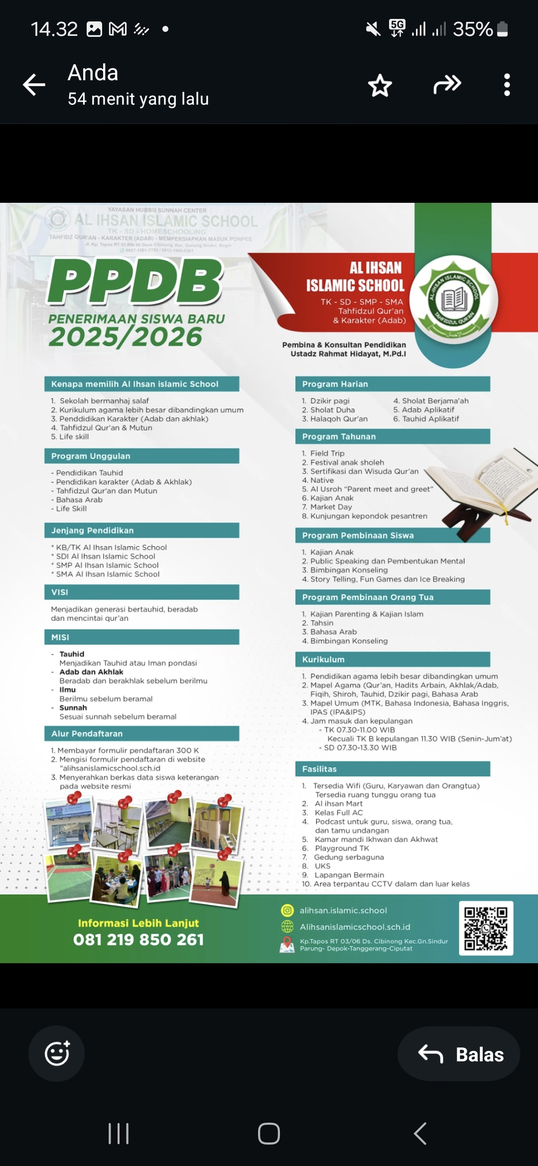 Assalamu’alaikum Warahmatullah Wabarakatuh_SAMBIL SEKOLAH PLUS MENGHAFAL QUR’AN, MAU??SDQ Imam Baihaqi merupakan Sekolah Dasar formal yang berada di bawah naungan Depdiknas yang mengajarkan siswa/siswinya pelajaran umum dan pelajaran agama ditambah pelajaran khusus untuk menghafal Al-Qur’an.Alhamdulillah…. Pendaftaran peserta didik baru SDQ Imam Baihaqi tahun pelajaran 2019/2020 telah dibuka. Pada tahun ini, SDQ Imam Baihaqi hanya menerima 2 kelas yang setiap kelasnya hanya 20 siswa/kelas.KENAPA PILIH SDQ IMAM BAIHAQI?SDQ Imam Baihaqi mengajarkan pelajaran terbaik yaitu belajar Al-Qur’anعَنْ Ø¹ÙØ«Ù’مَانَ – رضى الله عنه- عَن٠النَّبÙÙ‰ÙÙ‘ -صلى الله عليه وسلم- قَالَ «خَيْرÙÙƒÙمْ مَنْ تَعَلَّمَ Ø§Ù„Ù’Ù‚ÙØ±Ù’آنَ وَعَلَّمَهÙ» رواه البخاريArtinya: “Ustman bin Affan radhiyAllahu ‘anhu berkata: “Bahwa Rasulullah shallAllahu ‘alaihi wasallam bersabda: “Sebaik-baik kalian adalah yang belajar al-Quran dan mengajarkannya.†Hadits riwayat Bukhari.Selain itu SDQ Imam Baihaqi menawarkan :1. Biaya Pendidikan di SDQ Insya Allah murah tapi bukan murahan.2. Pelajaran Agama dan Umum Seimbang ditambah Pelajaran Tahfizh harian.3. Membiasakan Siswa-siswinya dekat dengan al-Qur’an4. Tempat Belajar yang Insya...
